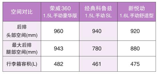 经典科鲁兹后排头部空间达到940mm,只不过整款车中间隆起幅度都比较高,坐在中间的乘客难免会感觉不够舒适;461L的后备箱空间,也稍逊于荣威360。作为一款家用车型,新悦动880mm的后排腿部空间则显得中规中矩,475L的行李箱空间也基本能够满足家庭出行需求,但车内部分设计不太人性化。