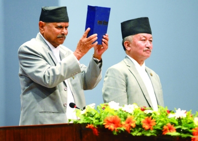 9月20日,尼泊尔加德满都,总统亚达夫在议会大厦宣布施行《尼泊尔联邦民主共和国新宪法》。