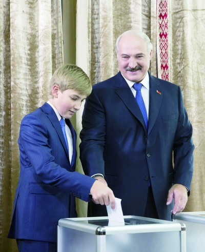 10月11日,白俄罗斯明斯克,总统选举投票正式开始,白俄罗斯现任总统卢卡申科与儿子尼古拉·卢卡申科现身投票。