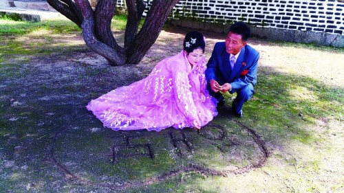 佩戴领袖像章的新婚夫妇蹲在心形图案前许愿。 |