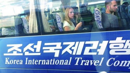 西方游客在旅游大巴上透过车窗看平壤。 |
