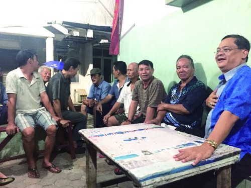 12月6日这天,伍瑞章来到叶碧丽所在的社区时已是晚上9点多。他来这里是要走访一户他帮助过的家庭。在这户人家门前,20多位社区居民(中老年女性居多)搬来自家的塑料凳,在并不宽阔的过道上一字排开。多数时候是伍瑞章一个人在讲话,有点像一场小型讲演。伍瑞章穿着亮蓝色的印尼传统服装“巴迪”衫,声音高亢、表情丰富,肢体动作幅度非常大。闽南话是这场与选民见面活动的“官方语言”,现场时而有笑声。