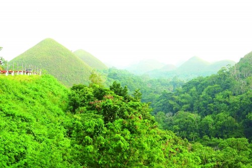 岛的中央地带,群集着1000多座几十米到100多米高的小山包,像倒扣的窝头,顶部浑圆,通体被草木覆盖得严严实实。据说在旱季草木变成褐色,因此得名巧克力山,造就世界上独一无二的奇景。我的目的地就是那1000多座山里的1座,算是制高点。