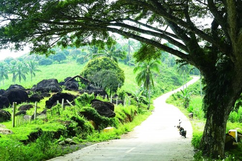 在观景台上四望,哪边都是弥望的绿色巧克力,让人又惊奇又纳闷:怎么可能有1000多座山长得像孪生兄弟呢?小山包之间的小块平地似乎都有人耕种,成熟的稻子还没收割,一片片泛着金色,田边、山脚下通常都会有几棵亭亭玉立的椰树,也遥遥地看得到几幢农舍,难免和诗人同怀:“桃花源里可耕田?”