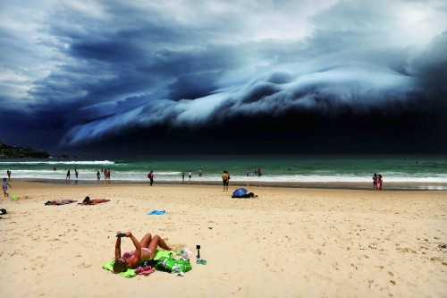 自然类单张一等奖:《暴风雨来临前的邦迪海滩》 2015年11月6日,澳大利亚悉尼,弧状云接近邦迪海滩,但一名日光浴者依然躺在沙滩上,仿佛完全无视恶劣的天气。 摄影:Rohan Kelly/澳大利亚 |