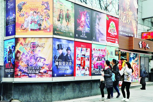 1月7日,上海市中心一家影院展示的春节档电影海报,春节档电影市场竞争激烈。 |