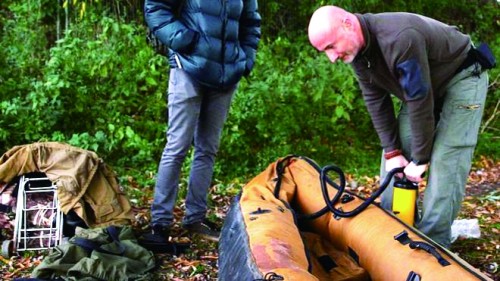 彼得·斯坦福正在用手动气泵充起他的皮划艇,准备在夜幕降临时,练习“逃离”。 |