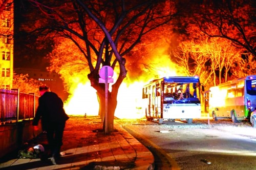 2月17日,土耳其首都安卡拉,国会及军方总部附近发生汽车炸弹爆炸,爆炸使多辆汽车起火。