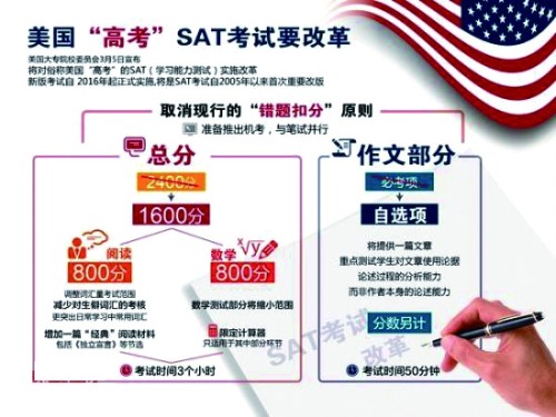 新的SAT已于3月5日在美国开考。被称为“美国高考”的SAT的重大改革让很多学生、家长和考试辅导机构焦虑。考试专家认为,从长远来看,SAT改革对考生来说是一件好事。
