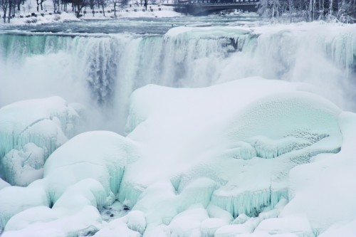 这个冬天,我捧着一杯冒着热气的咖啡,在水雾弥漫的岸边漫步,熙熙攘攘的游客大声谈笑着从身边擦肩而过,轰隆隆的水声很容易令人陷入沉思。“雾中少女”早已不见踪影,河谷里是层层叠叠的冰,冰面上有巨大的龟裂,裂口一直向前延伸,延伸到依然壮阔的尼亚加拉大瀑布面前。