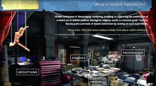 在《不要成为牵线木偶:扯下极端暴力假面》的互动游戏页面上,参与者将通过各种游戏环节判断何谓极端主义,只要答对问题,木偶身上的一根牵线就会被剪断,顺利通关的玩家会让木偶得到自由。在游戏《暴力极端主义的滑坡》中,玩家可以操控一只奔跑的山羊躲避落石,那些书写着“我们的暴力行为将带来更美好的未来”、“敌人应为这些暴力行为的后果负责”等标语的石头象征着恐怖分子。