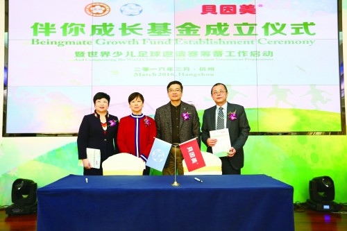 本报讯(记者温莎)为落实国家大力发展青少年足球的有关精神,进一步助力中国青少年足球事业的发展,由中国友好和平发展基金会和贝因美共同发起的“伴你成长基金成立仪式暨世界少儿足球邀请赛筹备工作启动仪式”于3月2日上午举行,双方达成长达10年的捐赠合作,首批捐赠款物合计6400万元。
