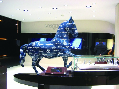 在浪琴展厅的显眼位置,摆放着一匹天蓝色的木马,1:1的大小,马的周身印满了浪琴表各种造型不同的标志。为什么在手表展厅摆了一匹马呢?原来,浪琴表自从问世就与马术运动结下了渊源,已经形成了一百多年的传统。浪琴表曾推出过骑仕系列,这个系列中的手表款式和马术运动都有关联,比如有一款女表的形状就是马蹄形。在木马身上写满浪琴的标志,就是向勇敢的骑手和英俊的马匹致敬的意思。