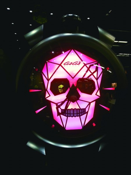 走进下一个展厅,一个大大的骷髅表盘赫然映入眼帘。黑色的表壳、表盘和表带,没有时间刻度,表盘上只有一个粉色或者艳黄色的骷髅图案,怀表式样的发条位于表盘正上方12点处——这就是意大利品牌——GaGa Milano手表。据代理商介绍,GaGa Milano手表中,骷髅头像款最受欢迎,因为它符合年轻人猎奇、追捧怪异式样的心理。那些有时间刻度的样式却并不好卖,虽然也有色彩变化、数字造型夸张,但一看就知道是手表。戴手表的目的不只是看时间,装饰效应同样重要。这个牌子没有全自动表,都是石英和半自动,它的设计师说:“GaGa Milano表是要搭配时装和场合的,不可能每天都带同一个款式……”