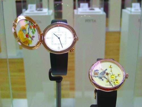 飞亚达表自从2011年参展,就一直位居钟表珠宝博览会的1号展馆,与百达翡丽、欧米伽、劳力士等一线品牌同在一厅。今年飞亚达艺术表的代表作是精微绣的表盘图案,四款单面绣,图案分别是:鹊喃、蝶恋、清禅和鱼嬉;一款双面绣,在可翻开的表盖两面绣着双猴迎春。刺绣大师以其独特的双面异色异样的刺绣手法,在表盖两面展示出完全不同的两幅画:正面是猕猴攀枝,怀抱蜜桃,上方是碧绿的树叶。揭开表盖,背面是金丝猴手捧鲜红果实。双面双猴,双色双态。飞亚达表的销售代表给客人们讲解了这幅双面绣的独到之处:首先采用的丝线极其纤细,是普通丝线的八分之一;为了易于收藏,对丝线进行了防腐处理,同时刻意避开纯白色、大红色等颜色,整体色彩艳丽而仿旧,为的是追求效果的永久。通过丝线色彩的搭配和针法的变幻,正反面的金丝猴都惟妙惟肖,出神入化,毛发在阳光下散发着迷人色泽,可爱逼真。