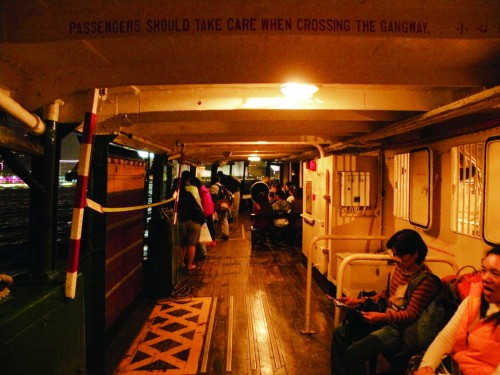 小轮靠岸,信号灯闪烁着百年的沧桑,笨重的电扇不停地摇动着,吹散通道内陈旧的潮气。船员拉开沉甸甸的铁栏门,一艘和超一流国际大都市格格不入的蒸汽船映入眼帘。一排排长长的木椅不知被油漆刷了多少遍,椅背设计巧妙,向对侧拉动便可将“倒座”变为“正座”,乘客自己动手即可。