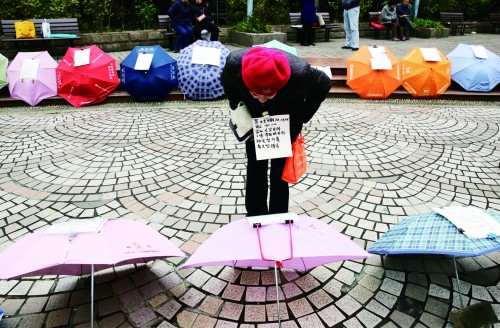 上海市人民公园“相亲角”内,一位脖子上挂着孩子信息纸板的老人观看雨伞上的择偶信息。 |