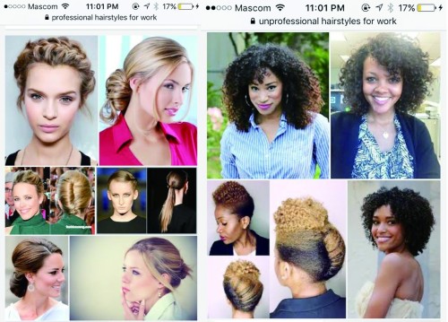 在谷歌上搜索“不职业的发型”,显示的多是发型天然的黑人女性,而“职业发型”则多是白人女性。 |