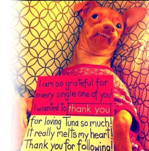 自2011年主人考特尼·戴舍(Courtney Dasher)为它开设了专属账号,Tuna便一跃成为社交媒体新星。它在Instagram上拥有近百万粉丝,在脸谱网上的人气甚至超过了保罗·麦卡特尼、坎耶·维斯特等大牌明星。