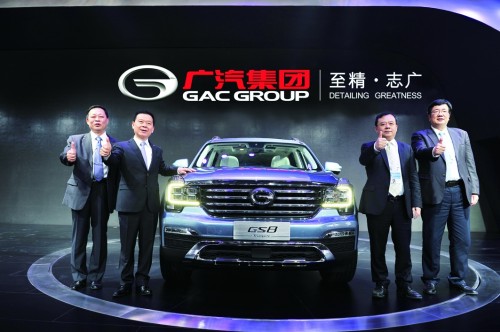 中国国际贸易促进委员会汽车分会会长王侠;广汽集团副董事长、总经理曾庆洪;广汽集团执行董事、广汽乘用车董事总经理吴松;广汽研究院院长黄向东与传祺GS8合影。