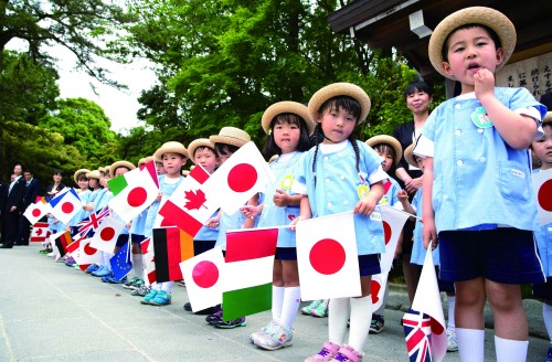 5月26日,日本伊势,学生手持国旗等待G7领导人访问伊势神宫。