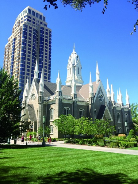 那天中午,小艾陪我们到摩门教的总部圣殿广场参观。说起盐湖城,不得不提摩门教。19世纪中期,教派创始人杨百翰(Brigham Young)为躲避宗教迫害,率领耶稣基督后期圣徒教会(编者注:此为“摩门教”的正式名称,该教派不属于基督信仰各宗派运动的任何一个分支,且在信仰内容上与基督教有别)教友长途跋涉来到盐湖城并定居下来。圣殿广场就坐落在市中心,这里也是全球摩门教的中心,摩门教堂、礼拜堂等建筑都集中于此。