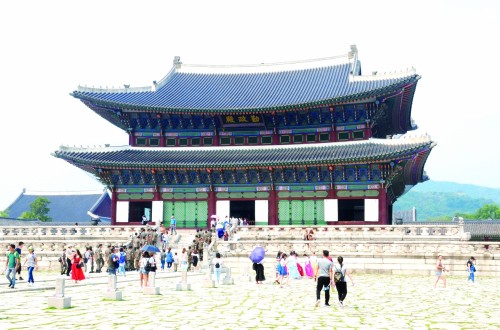 在中文讲解员的带领下,我们首先来到汉阳都城——朝鲜王朝的首都。这里保留有为防御外敌而修建的长约18.6公里的城墙,已有600多年历史。我们从墙外的高楼大厦穿越到墙内的传统韩式建筑,斑驳的城墙内外仿佛存在两个平行的世界。城墙上开有小的暗门,方便当时在城门关闭后有急事的人进出。讲解员开玩笑道,如果有人坚持徒步走完全部城墙,那就是减肥之旅了。