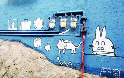 沿着东大门附近的城墙一路上行,便来到梨花洞壁画村。这里是韩剧和综艺节目的首选取景地之一,也是电视剧《屋塔房王世子》男女主角的浪漫约会地点。
