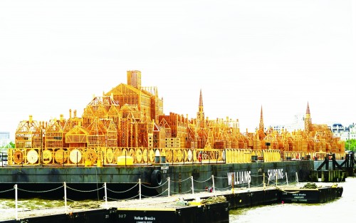 9月4日,伦敦泰晤士河两岸格外热闹,各国游人兴奋地冲着河边指指点点,就连伦敦本地人也混杂在人群里,时不时地举起手里的相机或是手机。相机对准的目标是停靠在泰晤士河边的驳船,驳船上赫然屹立着巨大的木质模型,这座模型有120米长,完全用木头制成,细看上去,可以清楚地辨认出林立的房屋、尖顶的教堂、高耸的烟囱——而这,就是350年前伦敦的样子。