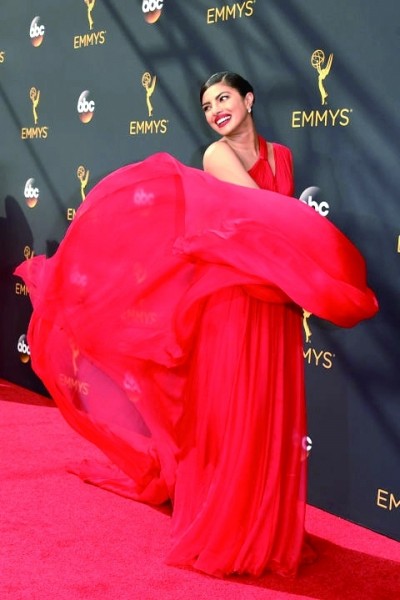 Priyanka Chopra的烈火红裙在“BAZZERLA”网站看来颇具张力。