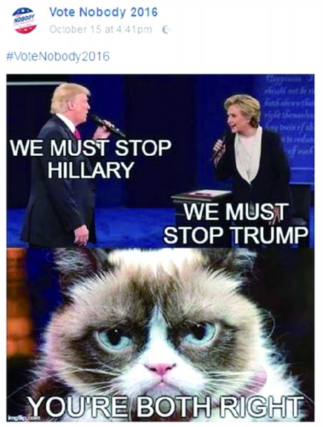 流传在社交媒体上的恶搞图——特朗普:我们必须阻止希拉里。希拉里:我们势必拦下特朗普。愤怒猫:你们都好有道理。