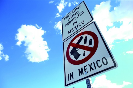 当地时间10月9日,美国亚利桑那州诺加利斯市,路边的标牌提醒司机“墨西哥禁止持有枪械弹药”。
