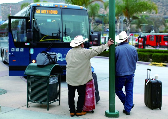 当地时间10月14日,美国加州圣伊西德罗市,从墨西哥过境的民众在等待搭乘大巴。