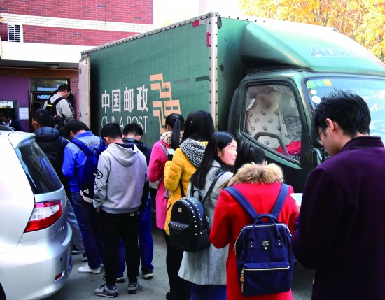 11月15日,山东青岛,山东科技大学,“双十一"后排成长龙领取快递的学生们。