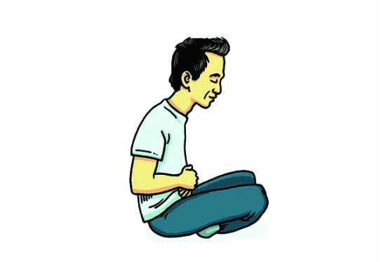 深吸一口气,鼓腹。停顿一下。从一数到五,慢慢呼出。重复四遍。