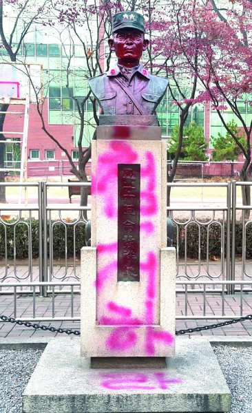 继朴槿惠之父朴正熙的故居被纵火后,12月5日,朴正熙位于首尔公园的半身像也遭喷漆污损。图片来源 CFP