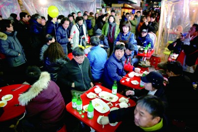 12月3日首尔举行新一轮大规模示威后,示威者在街边吃东西。持续的示威让一些商贩获利丰厚。图片来源 CFP