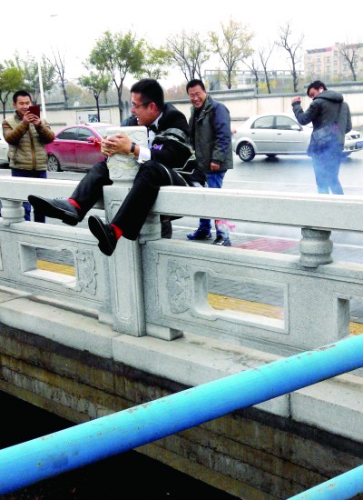 2015年11月23日,山东省淄博市,一名新郎被人用胶带捆在桥上,屁股上还挂着正在燃放的鞭炮,吸引了众多路人驻足观望。图片来源 CFP