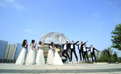 10月25日,浙江绍兴市区梅龙湖畔,一对新人被伴娘伴郎簇拥着。图片来源 CFP