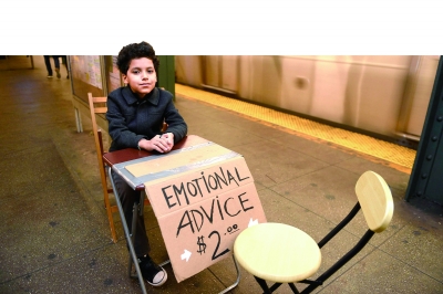 那张折叠牌桌的四周用胶带粘了一张纸板,纸板比桌面大了一倍,桌子打开时,多出的那部分便悬于桌前,上面手写的“情感咨询,两美元”的字样,吸引着地铁站里来来往往的人们。