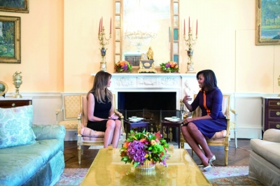 2016年11月10日,奥巴马和特朗普在椭圆形办公室进行一个半小时的会面时,米歇尔带领梅兰娜参观了后者未来的家。从传出的照片来看,两位“第一夫人”坐在金色椅子上喝茶聊天,脸上挂着彬彬有礼的微笑,显得十分融洽。