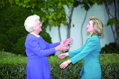1992年,芭芭拉·布什(左)在白宫欢迎希拉里·克林顿。