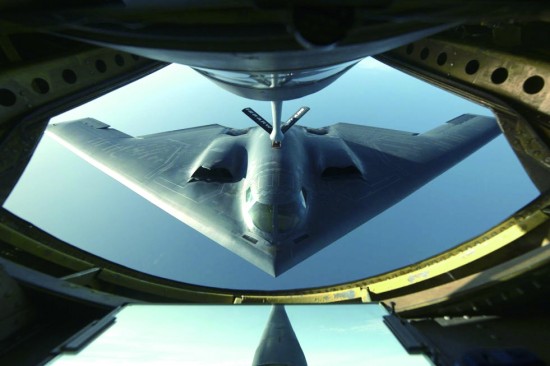 终于,空中加油的时间到了。B-2在飞往利比亚的途中需要两次补给燃料,无论天气如何或时间早晚。受油机在加油机正后方飞行,加油机慢慢伸出伸缩式加油吊杆。当吊杆末端的燃油喷嘴插入受油机上的端口,燃油就会快速泵入。