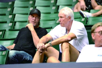 在湖人队的这场“宫廷政变”中,吉姆·巴斯(左)与总经理米奇·库普切克被赶下台。