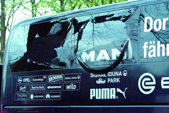 据英国广播公司(BBC)报道,在4月11日主场与摩纳哥队进行欧冠1/4决赛第二场比赛前,多特蒙德队乘坐的大巴遭遇3枚炸弹袭击。现场照片显示,大巴车胎破裂,车窗损毁,球队后卫马克·巴特拉手臂被震碎的玻璃划伤。