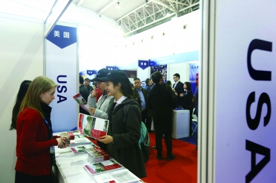 3月25日,北京国际教育留学巡回展上,女孩在美国留学展台咨询。图片来源 CFP