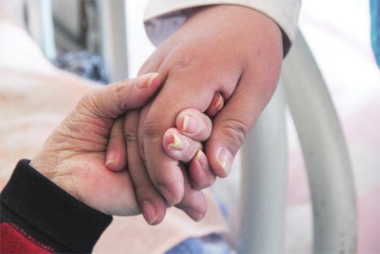 北京松堂临终关怀医院,一位老人拉着护士的手。图片来源CFP