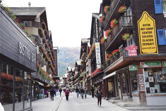 马特洪峰是瑞士的骄傲和象征,她的形象被艺术加工应用在包括巧克力在内的很多领域。山峰脚下有一座袖珍小镇——采尔马特,这座长度不超过1200米的小镇每日迎接着全世界的观光客和滑雪者。这里虽然被群山围绕,酒店、餐厅、小店却一应俱全。街道两侧的商户纷纷用这天然的景致当招牌,商业街道和半山的酒店区被一条冰川融水形生的河流分隔,在半山的酒店中推开窗户,即可看到马特洪峰的全貌,走下山坡便可享受纯正的瑞士美味。采尔马特吸引着滑雪爱好者,也是瑞士知名的度假胜地。这里唯一缺少的现代化产物就是汽车——为保护马特洪峰的环境,采尔马特小镇禁止包括电动车在内的一切车辆入内。