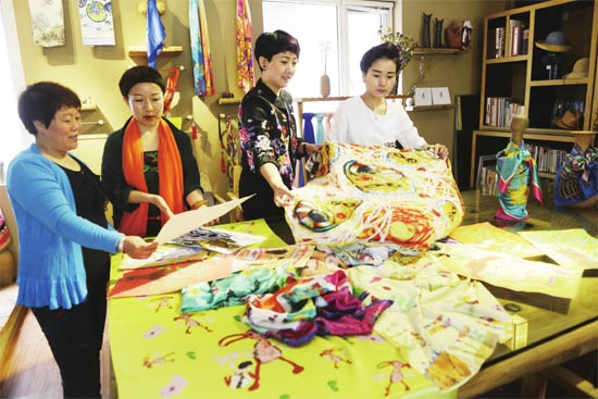 2016年4月26日,太原某私人定制丝巾工作室内,设计师苹果(左二)向客人展示丝巾作品。