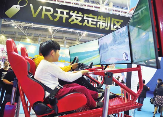 2016年11月12日,“第二届海上丝绸之路(福州)国际旅游节”上,游客正在体验定制VR游戏。
